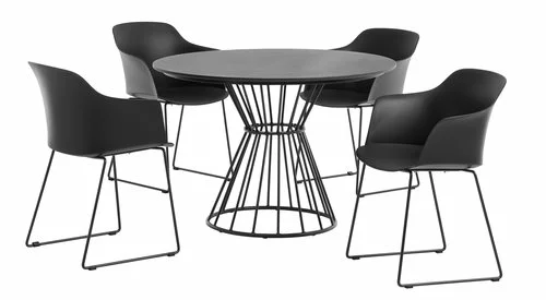 Bord: Stål och fibercement. Ø110 x H75 cm. Stol: Stål och formgjuten, UV-skyddad plast.