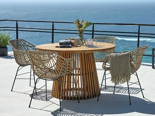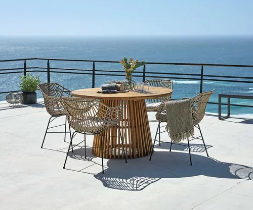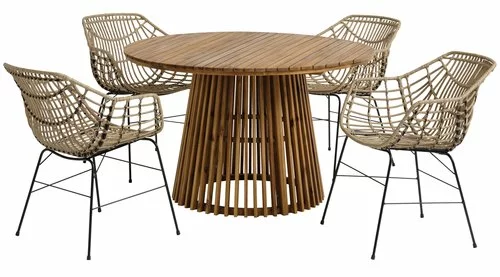 Bord: Oljat FSC® hårdträ. Ø120 x H74 cm. Stol: Stål och konstrotting.