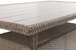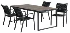 Bord: Aluminium och konstträ. B80 x L140 x H74 cm. Stol: Stål och konstrotting. Stapelbar.