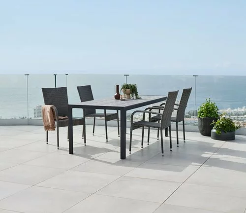 JUTLANDIA YTTRUP L150 Bord Hårdträ + 4 MADERNE Stapelstol Grå