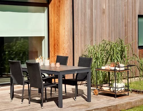| Material | Ställning: Aluminium, Bordsskiva: Konstträ (polystyren)Konstträ är ett underhållsfritt, syntetiskt material med naturlig trälook. Det är tillverkat av plast, såsom polystyren, som ger ett slitstarkt och väderbeständigt material. Konstträ är UV-skyddat, vilket säkerställer en färgbeständig yta., Ben: Aluminium |