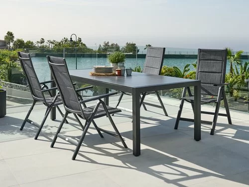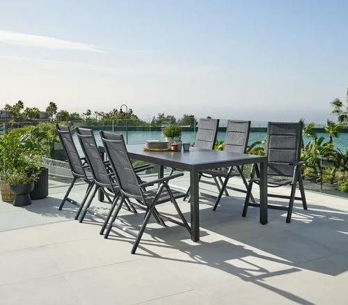 Bord: Aluminium och DURAWOOD® kompositträ, ett slitstarkt kompositmaterial som består av FSC® hårdträfiber och plast. B100 x L214 x H74 cm. Stol: Aluminium, textilene och snabbtorkande skumstoppning. 6 positioner. Hopfällbar.