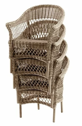Aluminium, galvaniserat stål och konstrotting. Stapelbar. B67 x H88 x D70 cm