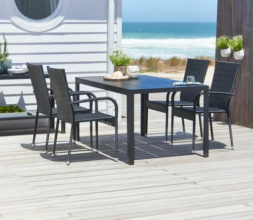 Bord: Aluminium och konstträ. B90 x L150 x H74 cm. Stol: Stål och konstrotting. Stapelbar.