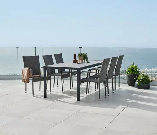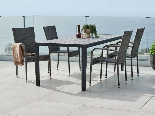 Bord: Aluminium och konstträ. B90 x L205 x H74 cm. Stol: Stål och konstrotting. Stapelbar.