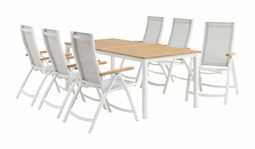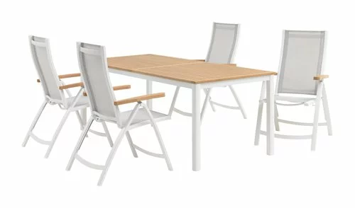 Bord: Aluminium och lackerat FSC® hårdträ. B90 x L206 x H74 cm. Stol: Aluminium, textilene och lackerat FSC® hårdträ. 5 positioner. Hopfällbar.