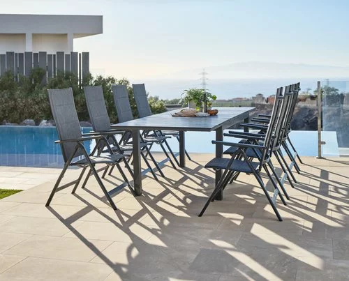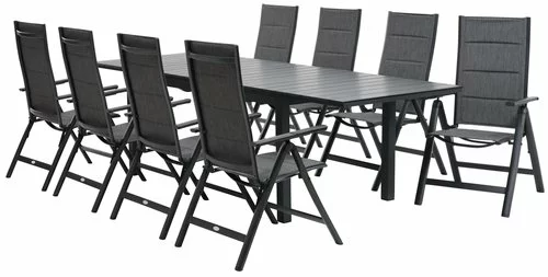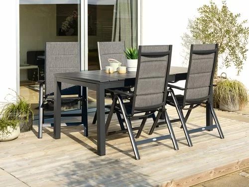 Bord: Aluminium och konstträ. Inkl. 2 klaffar, som kan förvaras under bordsskivan. B95 x L170/273 x H76 cm. Stol: Aluminium, textilene och snabbtorkande skumstoppning. 6 positioner. Hopfällbar.