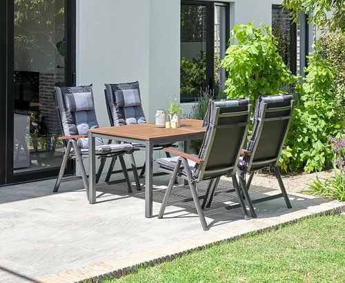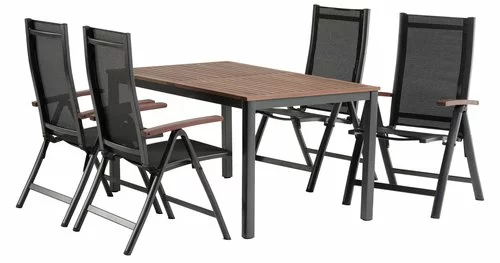 Bord: Aluminium och oljat FSC® hårdträ. B90 x L150 x H75 cm. Stol: Aluminium, textilene och oljat FSC® hårdträ. 6 positioner. Hopfällbar.