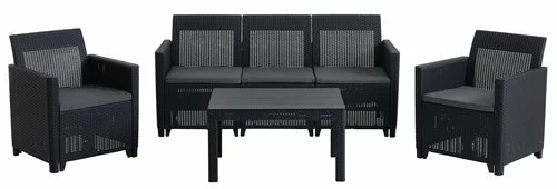 Bord: UV-skyddad plast. B78 x L59 x H43 cm. 3-sits soffa och stol: UV-skyddad plast. Inkl. dynor.
