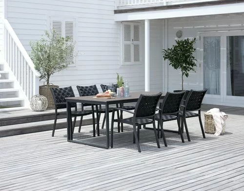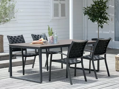 Bord: Aluminium, stål och konstträ. B100 x L210 x H74 cm. Stol: Aluminium och UV-skyddad polypropylen. Stapelbar.