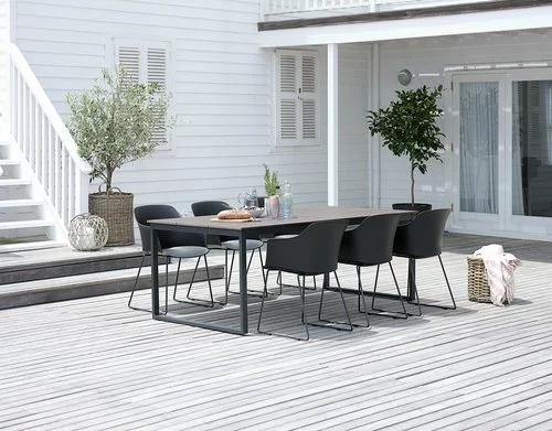 Bord: Aluminium, stål och konstträ. B100 x L210 x H74 cm. Stol: Stål och formgjuten, UV-skyddad plast.